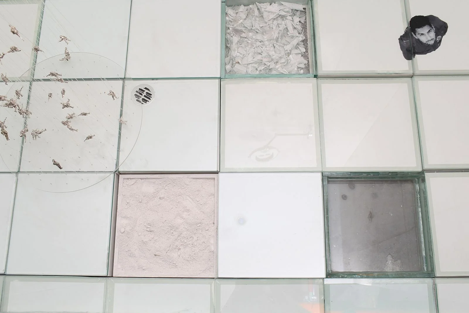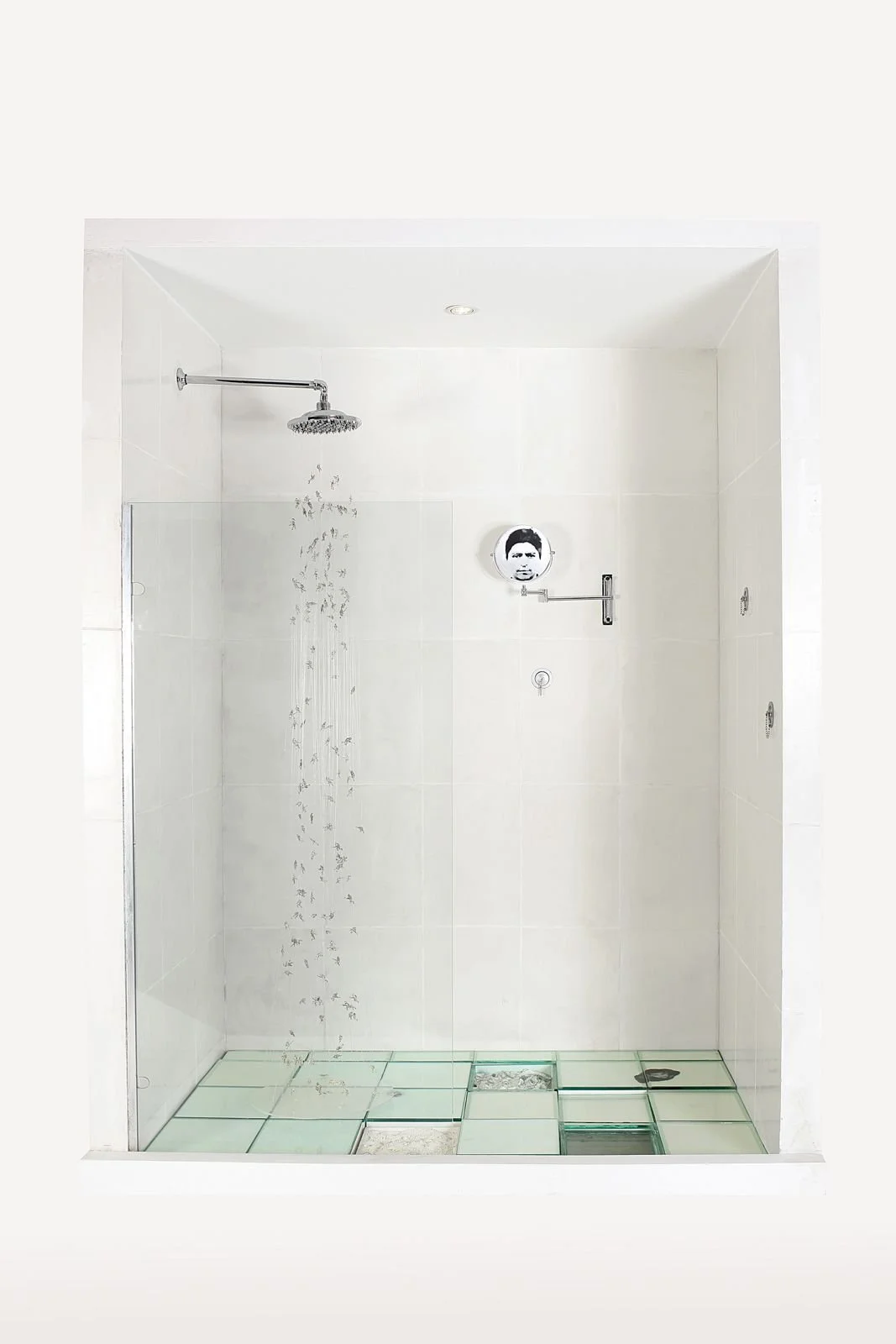 Nuestros momentos de intimidad son compartidos con otros. Así no estén presentes, las reflexiones que acompañan esos instantes están atravesadas por nuestras experiencias con lo ajeno, por historias que nos contaron, por sucesos que vivimos o por rostros que pasaron. Cuando tomamos un baño, sale a relucir esta dualidad entre el ego y lo extraño. Ahí, el agua cae sobre nuestros cuerpos, nos limpia y nos impregna con su pureza. Ella se mueve sobre nosotros a la vez que nuestra mente divaga y se va a otros espacios o tiempos. Cuarto flotante aborda precisamente esa ambigüedad: a través de un espejo doble situado en una ducha, nos invita a discurrir sobre nuestras propias complejidades y nuestra mente soñadora y dispersa, a la vez que propone reflexionar sobre las historias de otros. Ambas experiencias pueden ser tan cercanas o lejanas como cerca o lejos nos situemos del espejo.