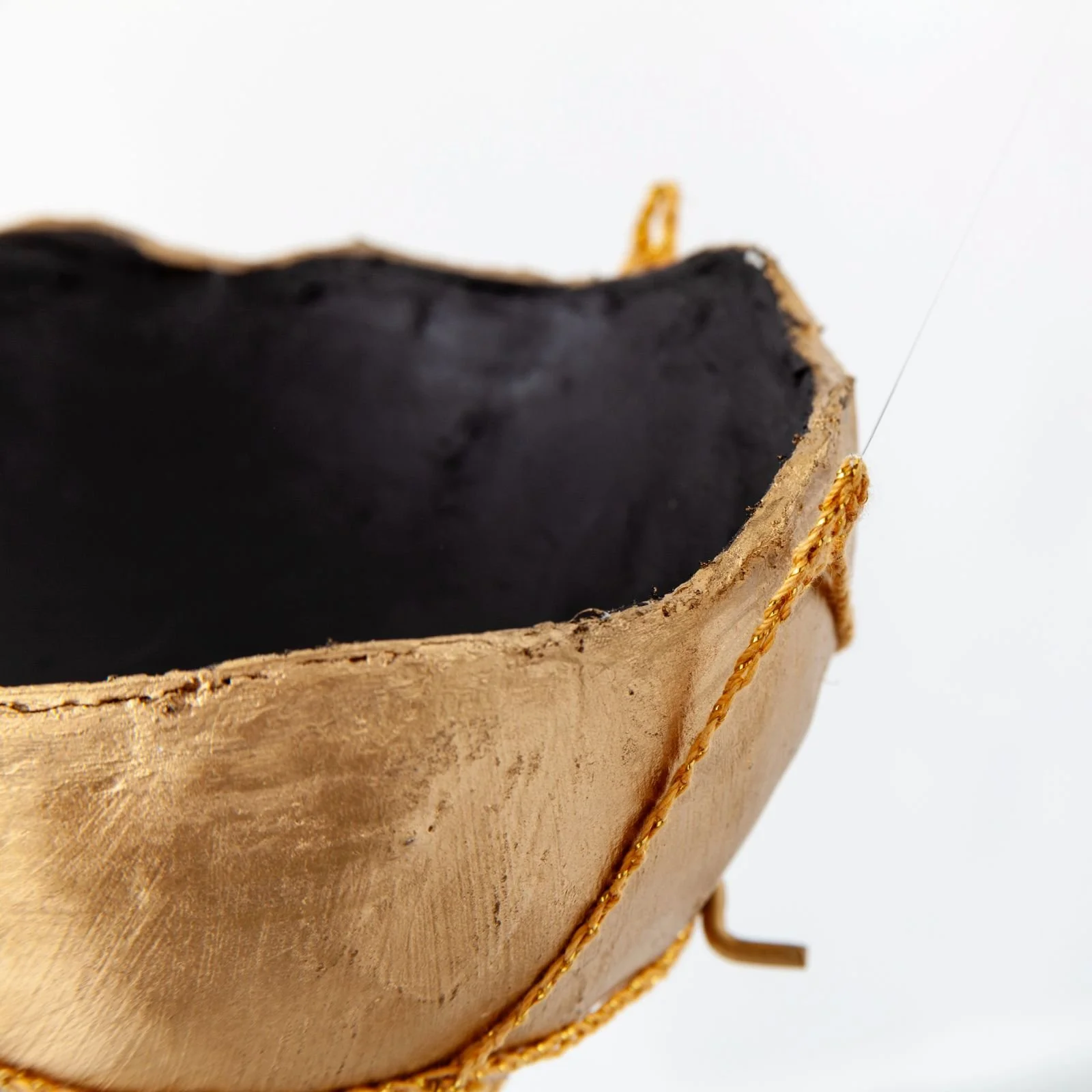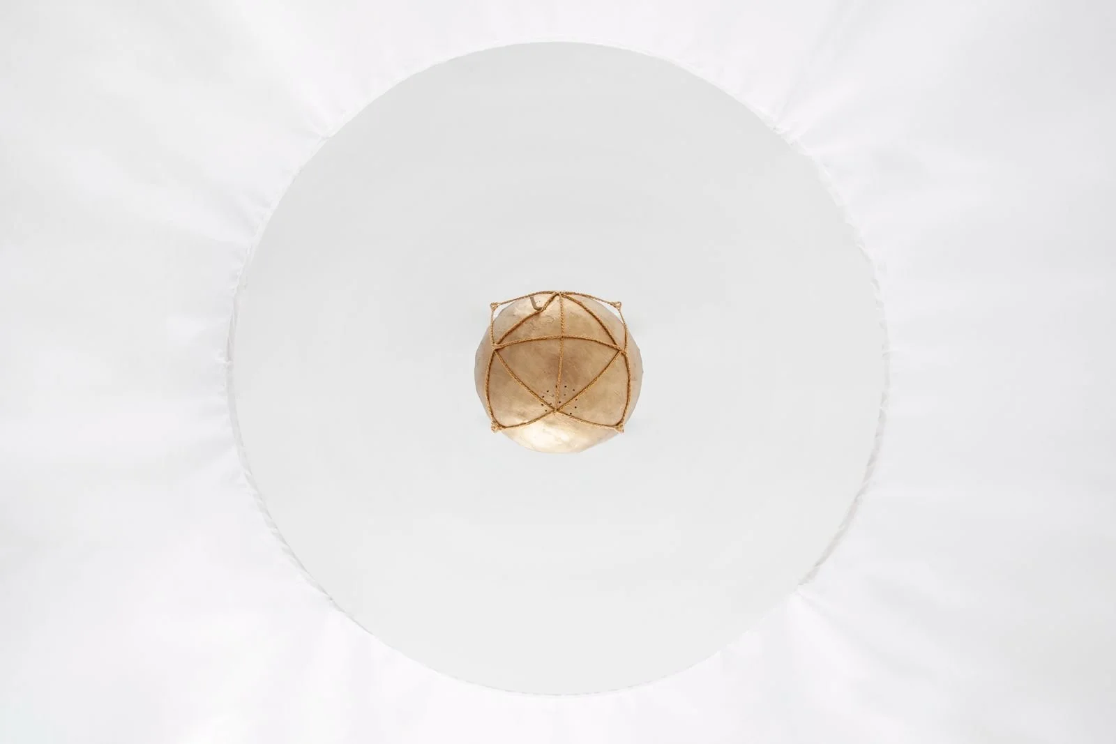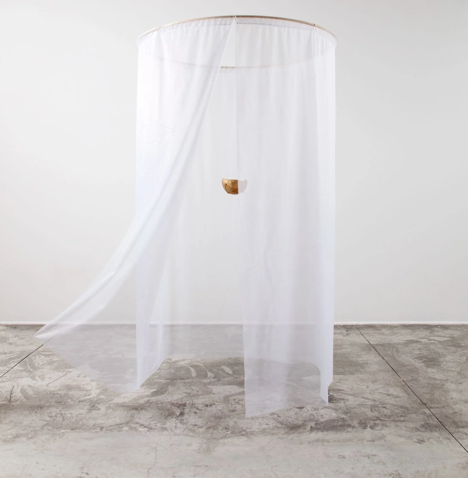 La primera de las piezas se titula Cántaros, y está distribuida en el salón principal de la galería. Se trata de una cortina que, desde el techo, cubre un cuenco laminado en hojilla de oro. Dentro de cada uno de los nueve cuencos que están dispuestos a lo largo del espacio, las personas podrán comunicar lo que quieran (un deseo, un pensamiento, una experiencia) y esas palabras serán traducidas en el lenguaje de los pájaros, que hace incomprensible e impenetrable el mensaje que están tratando de comunicar. Esta pieza surge de la fábula de las orejas de burro del rey Midas. Este rey, que todo lo convertía en oro, ocultaba su condición a todo el que lo rodeaba. Pero hubo alguien a quien no podía esconderla: a la persona que cortaba su cabello. Consciente del riesgo que corría, le hizo jurar a ese hombre, bajo amenaza de muerte, que jamás le contaría a nadie de su desgracia. El hombre aceptó, pero tiempo después, dejó de vivir tranquilo por el secreto que cargaba. Entonces, se le ocurrió ir a las afueras del pueblo donde vivía y cavar un hueco profundo. Una vez cavado, empezó a gritar “¡El rey Midas tiene orejas de burro! ¡El rey Midas tiene orejas de burro! ¡El rey Midas tiene orejas de burro!”. Cuando hizo esto, se sintió liberado. Así que cubrió el hueco con arena y dejó allí el secreto, justo donde un gran árbol creció. Cántaros se basa en la misma idea: el secreto como semilla, y su liberación como condición para que alguien pueda florecer como persona.
